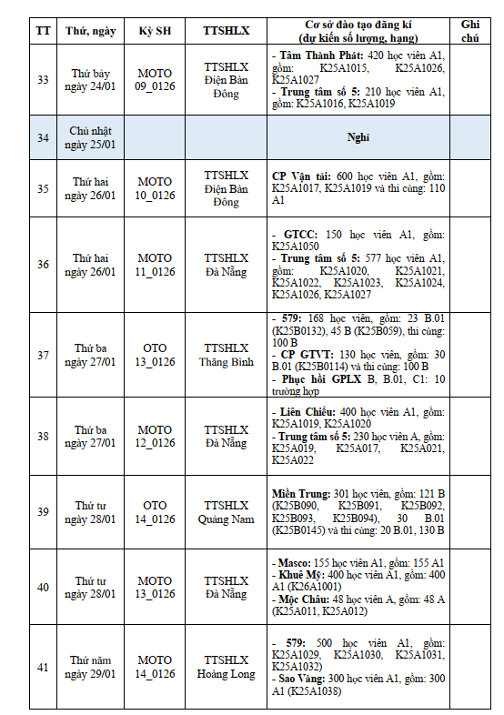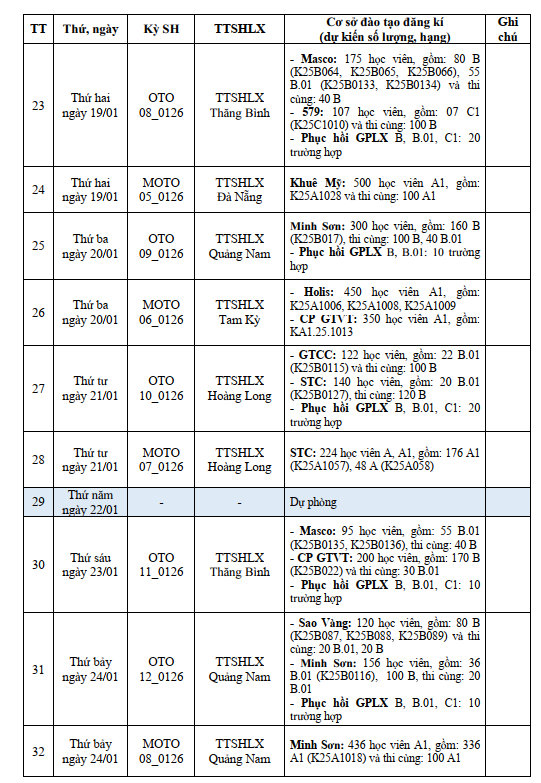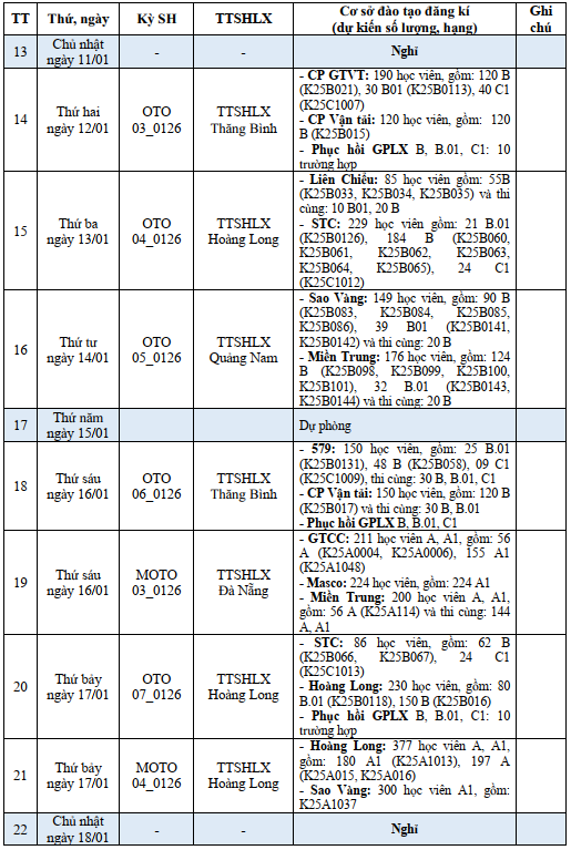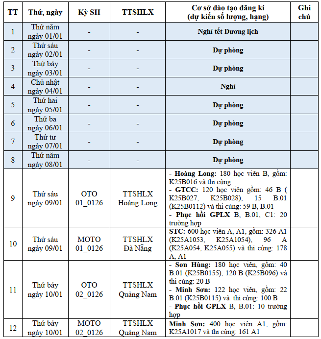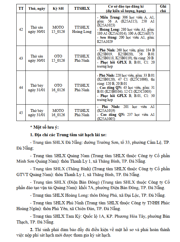 LỊCH THI SÁT HẠCH LÁI XE DỰ KIẾN THÁNG 01.2026 Ở QUẢNG NAM - ĐÀ NẴNG ( Đà Nẵng mới)